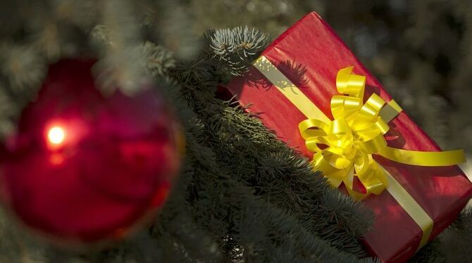 Ein Weihnachtspäckchen umgeben von Tannengrün mit einer Weihnachtskugel.