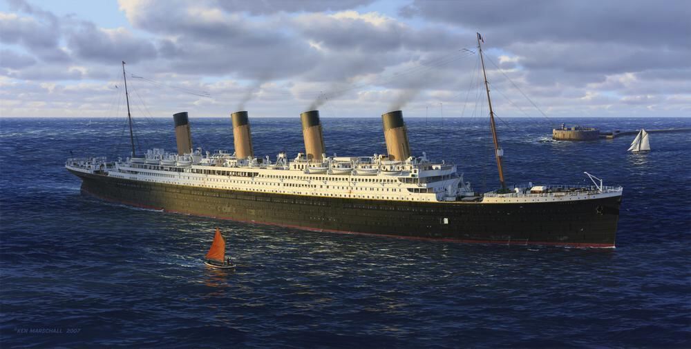 Illustration von Ken Marschall: Die Titanic auf ihrer Jungfernreise nach New York beim Einlaufen in den Hafen von Cherbourg, Frankreich, wo sie von Southampton, England, kommend weitere Passagiere aufnahm. COPYRIGHT: KEN MARSCHALL