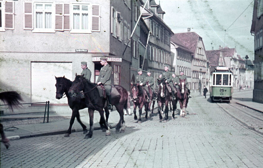 März 1940: Berittene Soldaten in der Albstraße vor einer Straßenbahn.