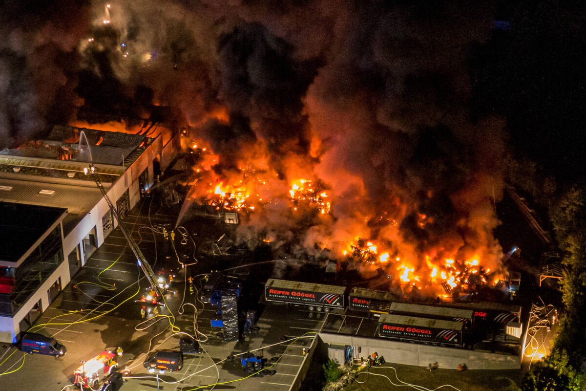 EinsatzFeuer bei Reifengroßhandel Göggel in Gammertingen1 / 411/412/413/414/415/416/417/418/419/4110/4111/4112/4113/4114/4115/4116/4117/4118/4119/4120/4121/4122/4123/4124/4125/4126/4127/4128/4129/4130/4131/4132/4133/4134/4135/4136/4137/4138/4139/4140/41Einsatzkräfte der Feuerwehr stehen während eines Großbrandes auf dem Gelände eines Reifengroßhändlers und löschen das Feuer. Auf dem Gelände fand eine Hochzeitsfeier statt. Im Vordergrund sind die Reste eines Feuerwerks zu sehen.Foto: Warnack41/41