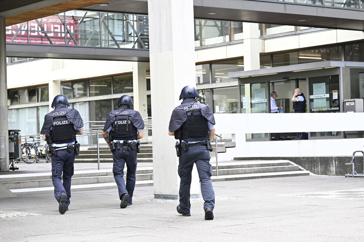 Bewaffnete Polizisten in schusssicheren Westen und Schutzhelmen gehen ins Reutlinger Rathaus, um nach einem Mann mit Pistole zu suchen.
