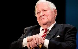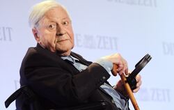 Altbundeskanzler Helmut Schmidt lächelt 2014 auf der Bühne bei einer Geburtstagsfeier für ihn im Thalia Theater in Hamburg.