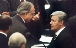 Der gestürzte Bundeskanzler Helmut Schmidt (SPD) beglückwünscht am 1.10.1982 seinen Nachfolger Helmut Kohl (CDU) zu dessen Wahl im Bundestag in Bonn.