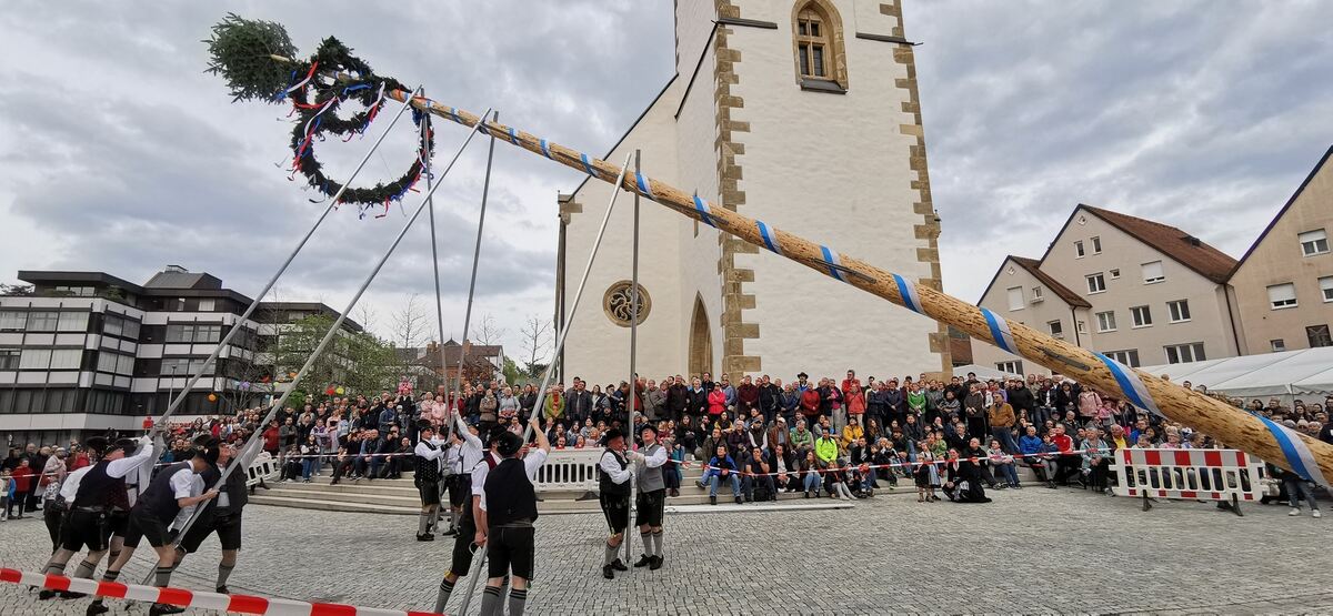 Konzentration und Muskelkraft von 16 starken Männern brauchte es, bis der Pfullinger Maibaum in der Senkrechten stand: Mithilfe von nagelneuen Stangenpaaren haben die »Burschen« vom Trachtenverein Echaztaler mit Unterstützern aus Reichenbach an der Fils den 25 Meter hohen und 750 Kilogramm schweren Stamm in Pfullingens Neuer Mitte aufgestellt. Die »Dirndln« des Vereins hatten die Krone und die Zunftzeichen angebracht. Gut 700 Neugierige, so viel noch nie, verfolgten das Spektakel, was den Echaztaler-Vorsitzenden Uli Sautter freute. Nach drei Jahren Abstinenz stehe der Maibaum nun endlich wieder da, wo er hingehöre: auf dem Marktplatz.