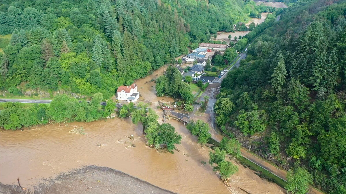 Die mit einer Drohne gefertigte Aufnahme zeigt die Verwüstungen die das Hochwasser der Ahr in dem Eifel-Ort angerichtet hat. In Schuld bei Adenau waren den Angaben zufolge in der Nacht zum Donnerstag sechs Häuser eingestürzt. Derzeit würden dort knapp 70 Menschen vermisst.