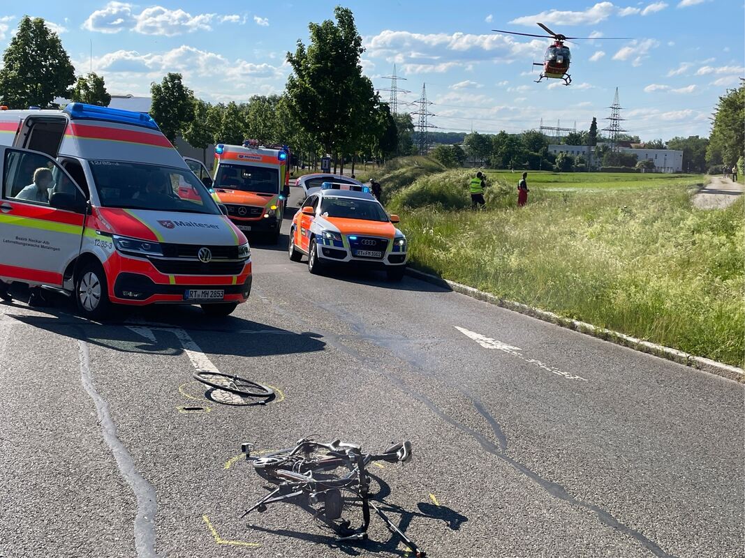 Der Zusammenstoß muss heftig gewesen sein - auf Fotos vom Unfallort ist ein völlig zerstörtes Rennrad zu sehen. »Der Radfahrer wurde schwer verletzt und musste mit dem Rettungshubschrauber in die Klinik gebracht werden«, so die Polizeisprecherin. Auch der 30-jährige Autofahrer sei leicht verletzt worden und kam per Rettungswagen in die Klinik. Neben Polizei und Rettungsdienst war auch die Feuerwehr im Einsatz. Der entstandene Schaden betrage 4.000 Euro, auch ein Abschleppunternehmen war vor Ort, um den beschädigten Fiat Punto abzutransportieren. Im Zuge der Unfallaufnahme und Bergungsarbeiten musste die Nordtangente zwischen der B313 und der K6762 bis etwa 19 Uhr gesperrt werden. (GEA/pol)
