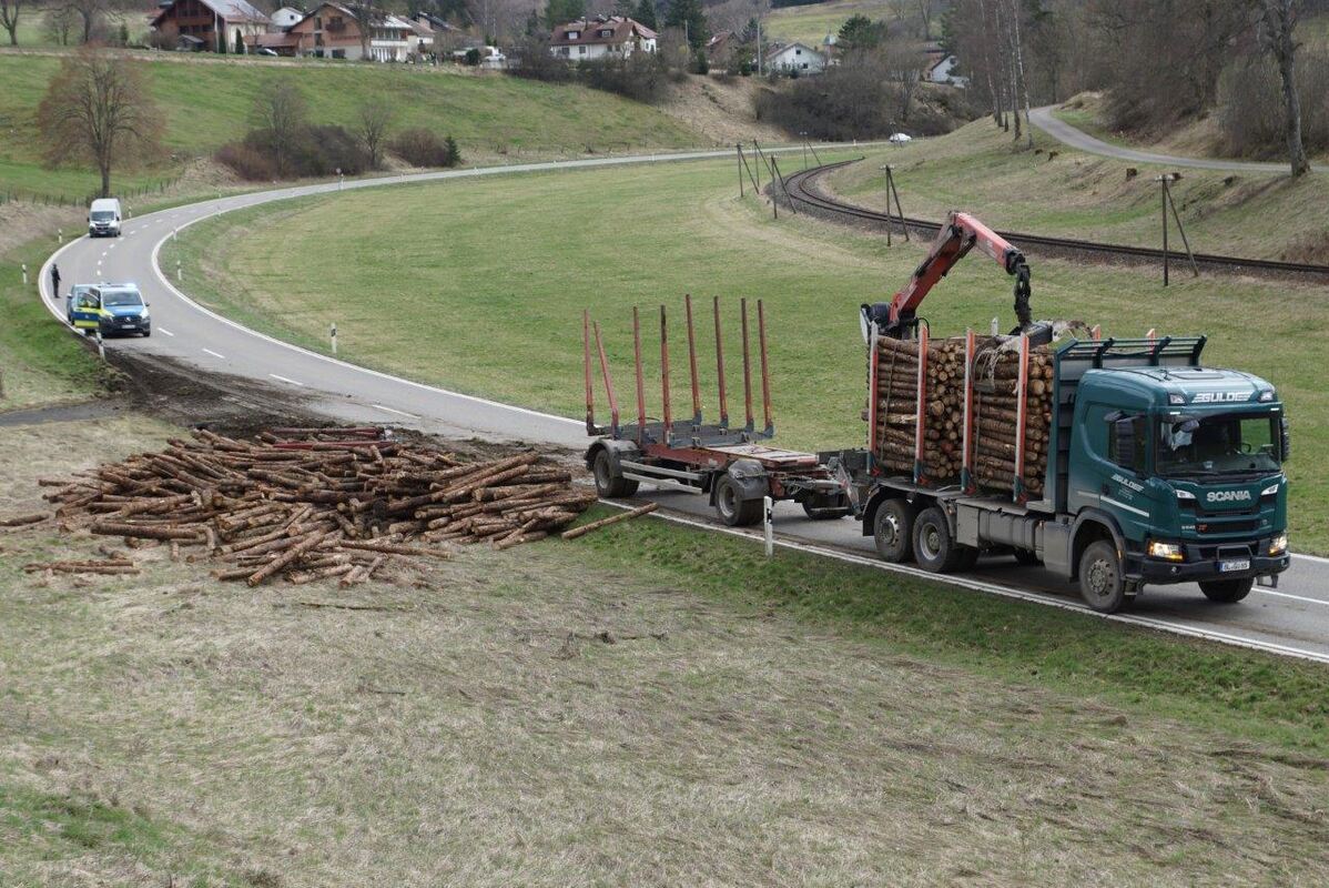 Bei einem Unfall zwischen Offenhausen und Kohlstetten ist ein Holztransporter umgekippt.