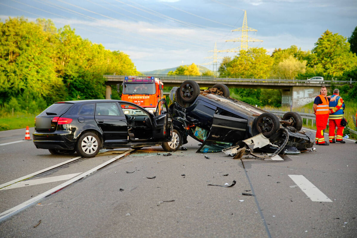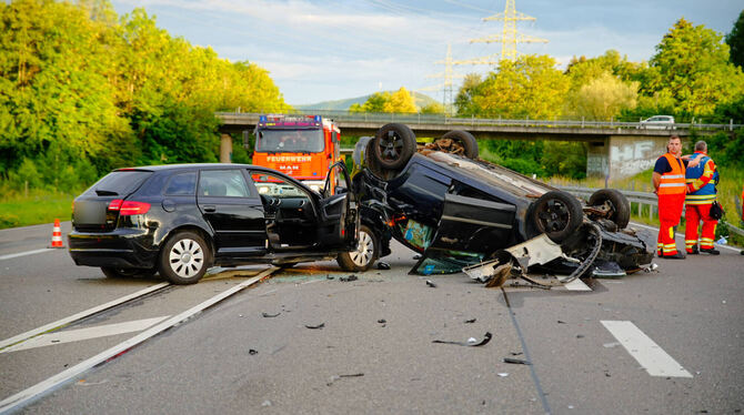 METZINGEN. Bei Metzingen hat sich am Montagabend ein schwerer Verkehrsunfall ereignet. Wie die Polizei auf GEA-Anfrage berichtet, bog eine 30-Jährige mit ihrem Audi gegen 19.40 Uhr an der Anschlussstelle Metzingen Nord auf die B312 in Richtung Reutlingen ein. »Sie kam vermutlich aufgrund zu hoher Geschwindigkeit ins Driften und kollidierte mit dem Ford einer 60-Jährigen«, sagt Polizeisprecher Michael Schaal. Der Zusammenstoß war so unglücklich, dass die Fahrzeuge sich verhakten und der Ford im Anschluss auf das Dach kippte.