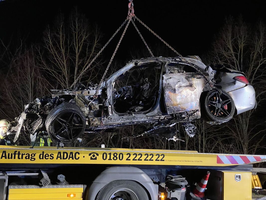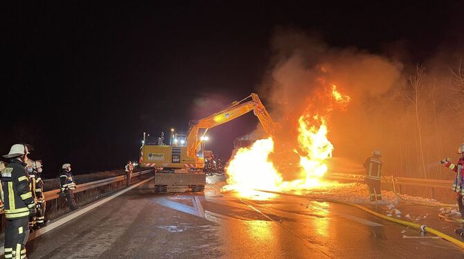 Durch auslaufende Betriebsstoffe und Funkenflug kam es dann zu einem Feuer, so die Polizei weiter. Der Lastwagen-Fahrer mitsamt eingeklemmtem Auto fuhr daraufhin auf die Standspur und schaffte es noch, seine Zugmaschine vom brennenden Auflieger zu trennen. Der mit großen Papierrollen beladen Auflieger sowie das eingeklemmte Auto »wurden ein Raub der Flammen«, heißt es im Polizeibericht. Die vier Insassen des Autos konnten sich mit leichten Verletzungen aus dem brennenden Wagen retten. Der Rettungsdienst brachte sie in umliegende Krankenhäuser.