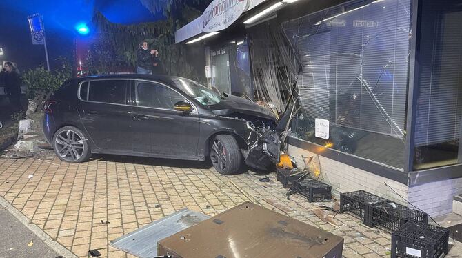 WALDDORFHÄSLACH. In Walddorfhäslach ist am Freitagabend ein Auto in das Schaufenster eines Ladens gekracht. Eine Zeugin teilte um 20.26 Uhr über den Polizei-Notruf mit, dass ein Pkw gegen ein Haus geprallt sei, berichtet die Polizei. Beim Eintreffen der ersten Streife bestätigte sich dies. Bei dem Pkw handelte es sich um einen Peugeot 308, vom Fahrer fehlte zunächst jede Spur. Aufgrund dessen wurde eine Fahndung mit mehreren Streifenwagen eingeleitet. Der Fahrer, ein 28-jähriger Mann, konnte kurze Zeit später unweit der Unfallstelle festgestellt und einer Kontrolle unterzogen werden. Im Rahmen der Kontrolle ergaben sich Hinweise auf eine alkoholische Beeinflussung. Ein Atemalkoholtest erbrachte einen Wert von über einem Promille.