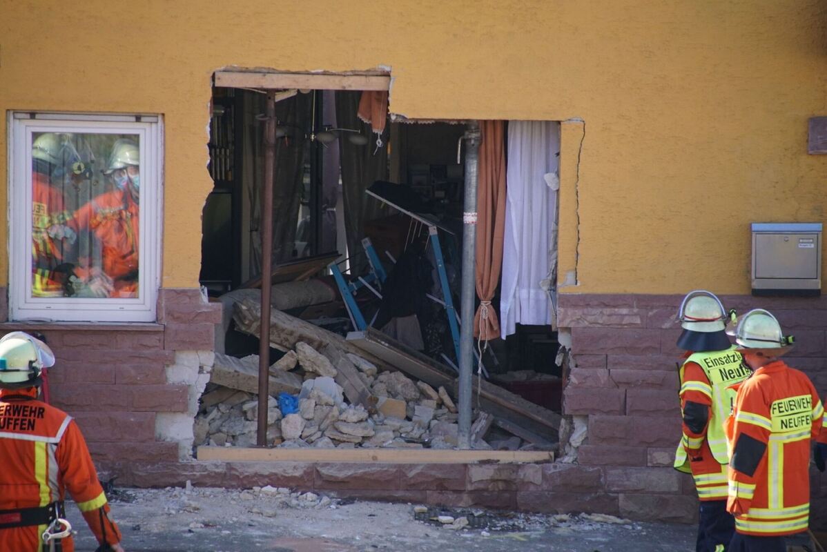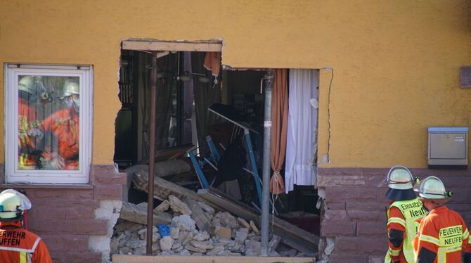 NEUFFEN. Bei einem Verkehrsunfall am Sonntagvormittag ist eine 48-jährige Seat-Fahrerin in ein Haus gekracht. Die Frau befuhr gegen 9.45 Uhr die Eberhardstraße und wollte an der Einmündung zur Burgstraße nach links abbiegen. Hierbei missachtete sie die Vorfahrt eines 77-jährigen VW-Golf-Lenkers, der aus Richtung Ortsmitte kam. Die Seat-Fahrerin verlor die Kontrolle über ihr Fahrzeug, streifte zunächst den VW-Golf, überfuhr den Gehweg und krachte anschließend nahezu ungebremst in eine Hausmauer. Der Seat durchbrach die Mauer und kam mit der Motorhaube im Wohnzimmer zum Stehen.