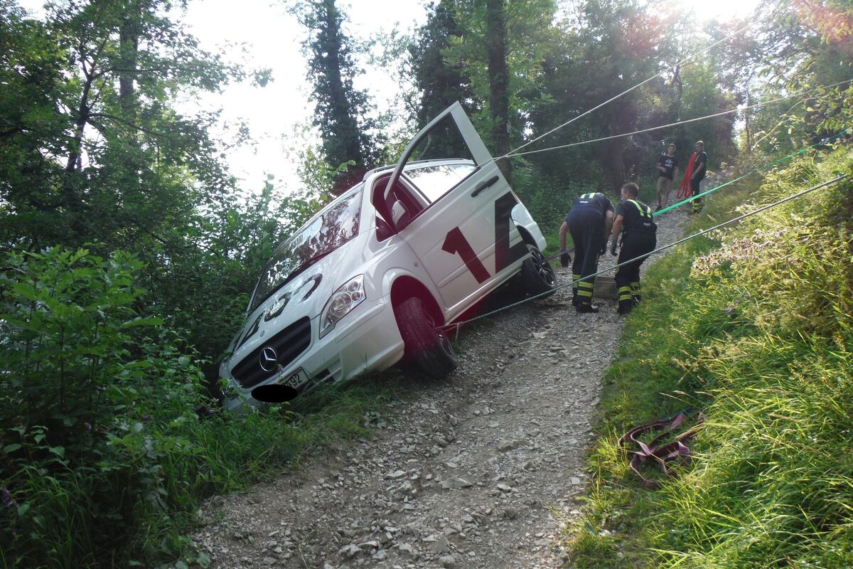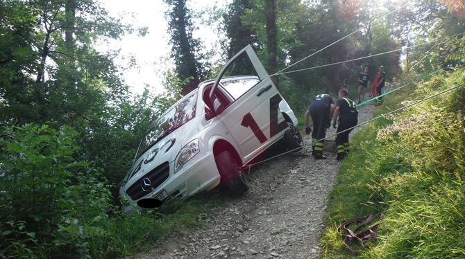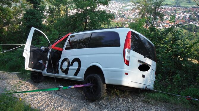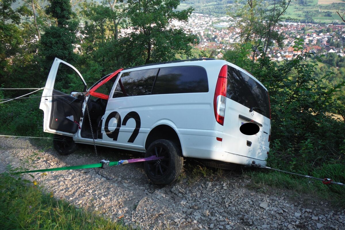 REUTLINGEN. Um 17:16 Uhr befanden sich vier Männer in einem geländefähigen Transporter auf einem Waldweg von der Achalmspitze hinunter zum Parkplatz, als ihr Fahrzeug zu nahe am Abgrund ins Rutschen kam. Glücklicherweise setzte das Fahrzeug auf der Kante des Waldweges auf und blieb dort stecken. Die vier Insassen konnten über die Fahrertüre das Fahrzeug kletternd verlassen.