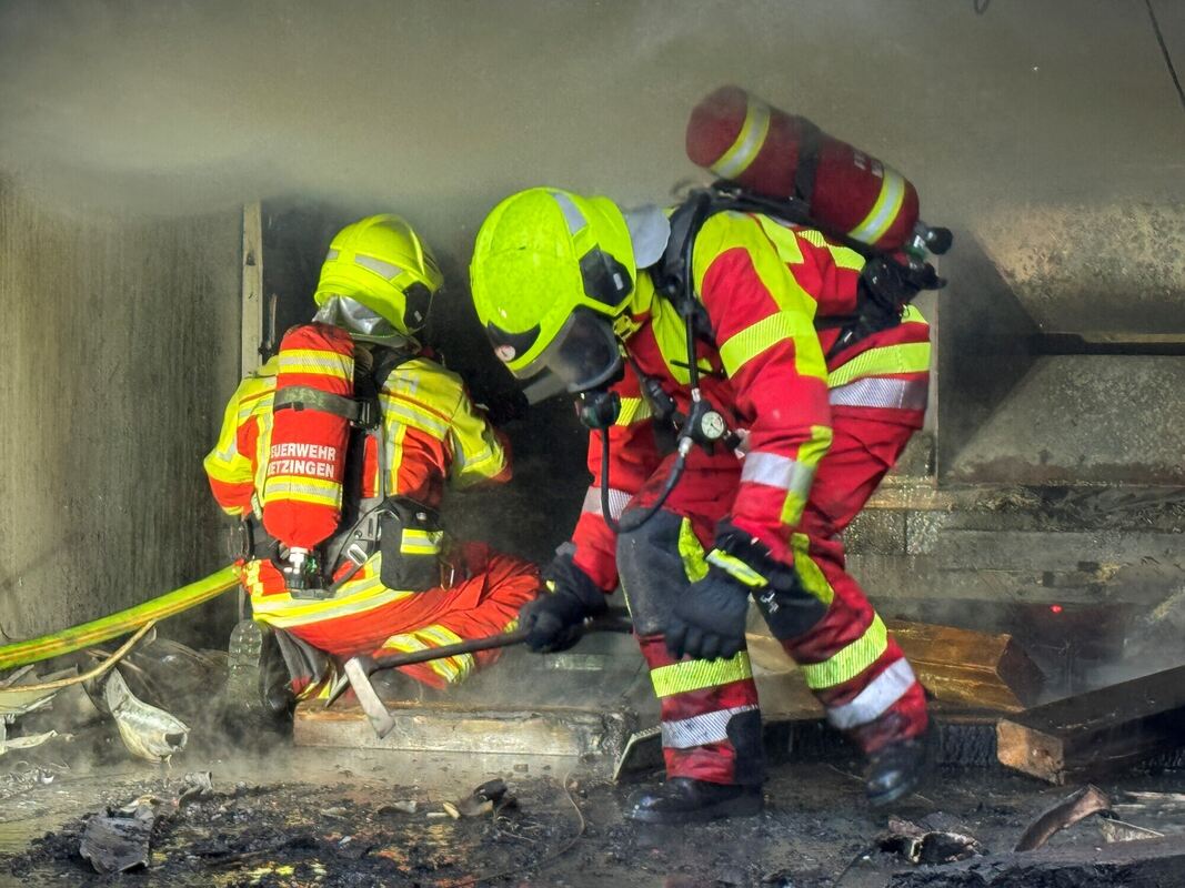 Die Feuerwehr sah sich in der Folgezeit mit dem Problem konfrontiert, dass es in einem Bunker lichterloh brannte, der überhaupt nicht zu begehen ist. Bei starker Rauchentwicklung versuchten die Kräfte unter schwerem Atemschutz einen Zugang zu schaffen, indem massive Holzbalken in mühevoller und kräftezehrender Handarbeit aus dem Bereich entfernt wurden, in dem im normalen Schießbetrieb die Zielscheiben angebracht werden. Diese wiederum befinden sich auf mehrere Hundert Kilogramm schweren Metallscheiben. Erst unter Zuhilfenahme eines Greifzuges gelang es schließlich, diese aus ihrer ursprünglichen Verankerung zu ziehen. Zwischenzeitlich hatten im Zielscheiben-Bunker mehrere Tonnen Holzbalken Feuer gefangen.