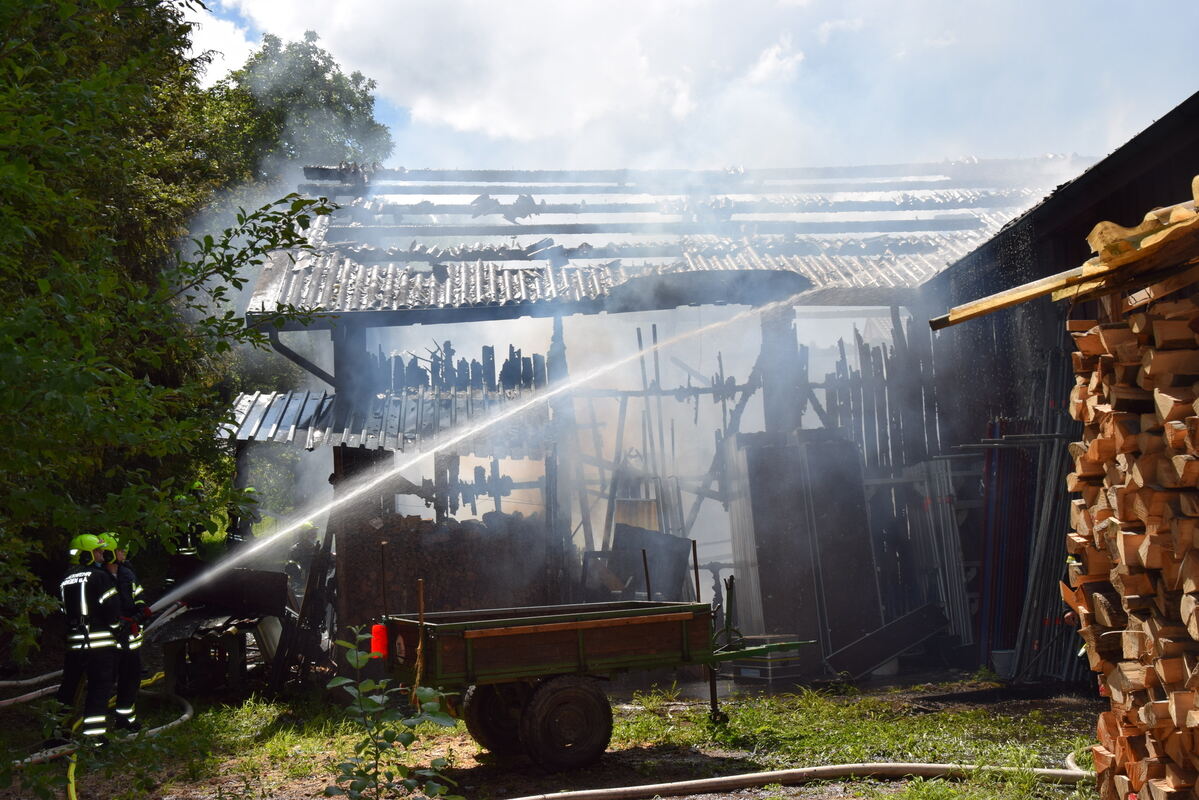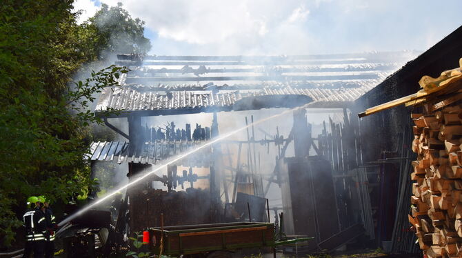 Nach Angaben der Polizei wurden drei Personen leicht verletzt, sie stünden unter Schock oder hätten Rauchgas eingeatmet. Die Höhe des Schadens ließ sich auf die Schnelle nicht konkret beziffern. Allein den Schaden am Schuppen taxierten die Beamten auf rund 100.000 Euro. Welchen Wert die landwirtschaftlichen Geräte hatten, die darin gelagert waren, müsse erst noch ermittelt werden. Die Feuerwehr hielt hielten ihre Brandwache am Samstag bis 21.30 Uhr aufrecht. Spezialisten der Kriminalpolizei sicherten Spuren am Brandort. Die Ermittlungen nach der Brandursache dauern noch an. (GEA)