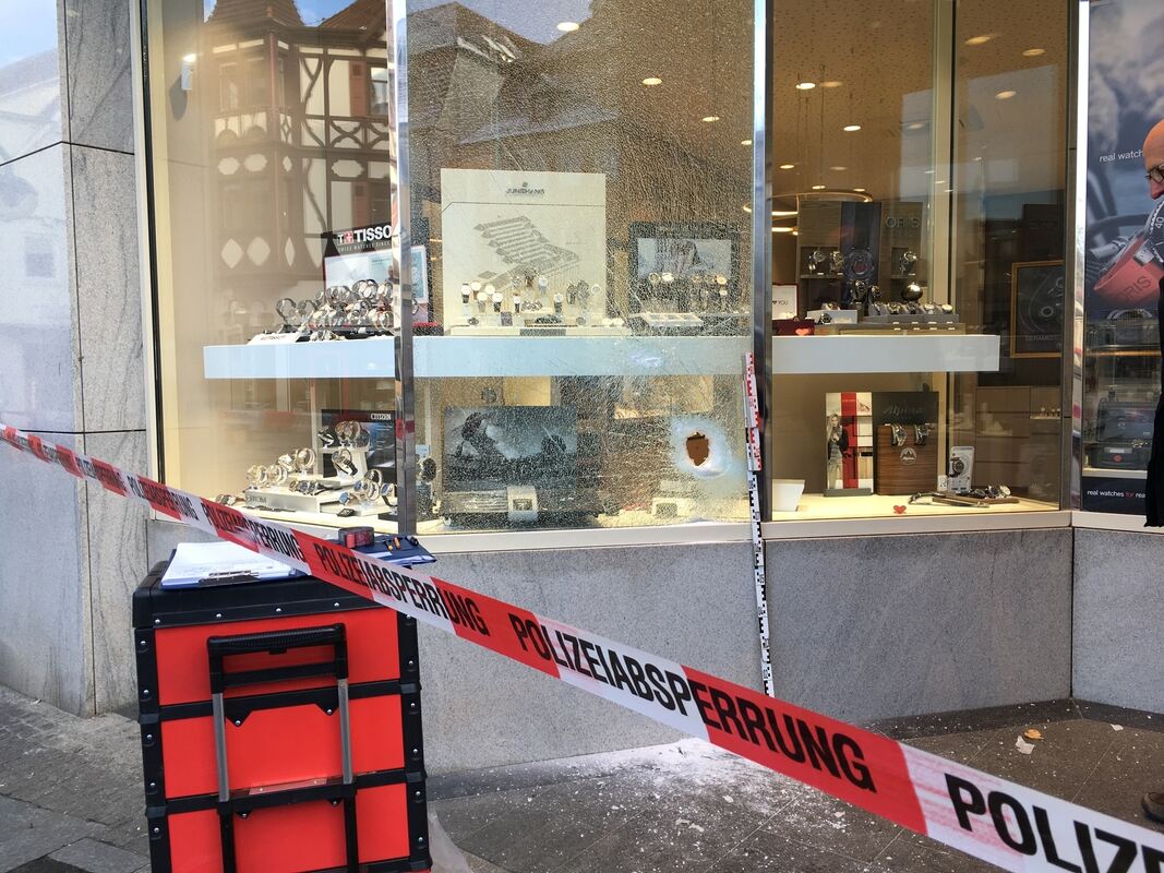 REUTLINGEN. Gegen 3.40 Uhr schlugen zwei maskierte Männer ein Loch in die Schaufensterscheibe, griffen durch die Öffnung und rafften aus der Auslage alle Uhren zusammen, die sie erreichen konnten.