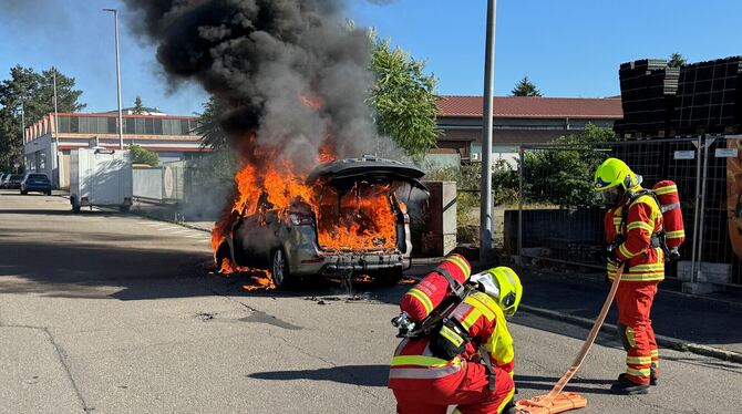 METZINGEN. Am Sonntag stand in Metzingen, kurz vor 18 Uhr, ein Auto der Marke Ford in Flammen. Der Brand ereignete sich an der Kreuzung Seefelder- und Gutenbergstraße, vor dem Lager des Baumarkts Obi. Das Feuer bemerkten Passanten. »Mehrere Anrufe gingen bei der Leitstelle ein«, so der Metzinger Feuerwehrkommandant Harmut Holder.