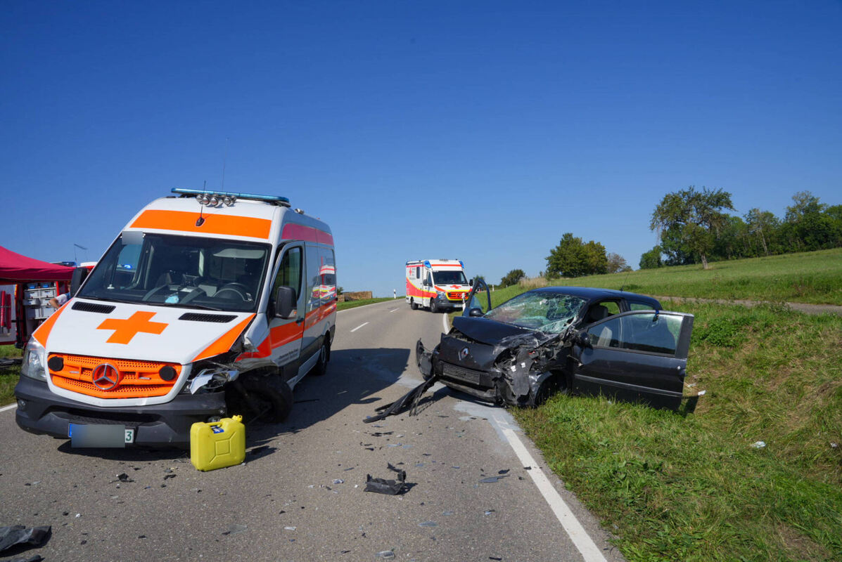 Dabei kam es zum Zusammenstoß mit dem entgegenkommenden Renault Twingo einer 60-Jährigen. Bei der Kollision wurden sowohl die beiden Fahrerinnen als auch die 24-jährige Beifahrerin im Rettungsfahrzeug sowie der 26 Jahre alte Beifahrer im Twingo verletzt. Alle Personen wurden mit Rettungswagen ins Krankenhaus gebracht. Ein vor Ort befindlicher Rettungshubschrauber musste nicht eingesetzt werden.