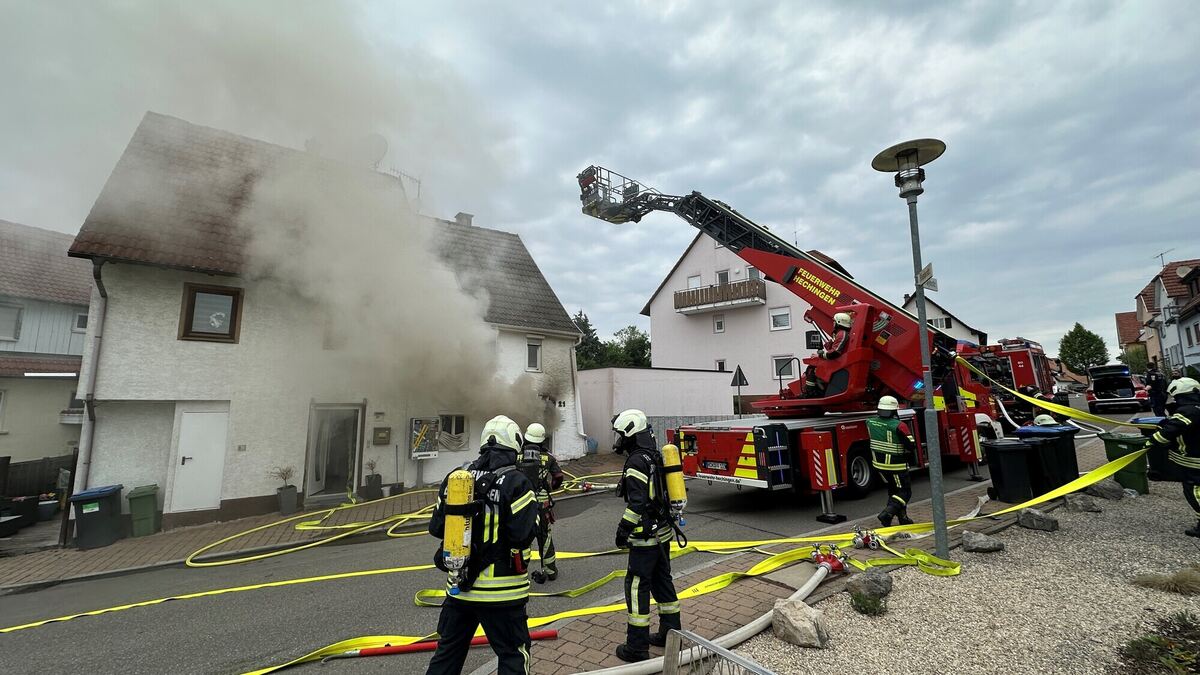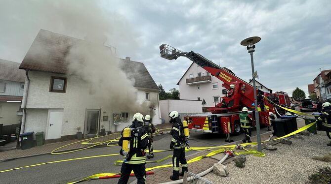 Der Brand in der Trayhstraße wurde um 16.25 Uhr gemeldet. Beim Eintreffen der Feuerwehr schlugen Flammen aus Türen und Fenstern eines Reihenhauses mit zwei Wohneinheiten, sagte der Leiter Führungstruppe. Der rechte Gebäudeteil war in Vollbrand. Die Warnapp Nina schlug um 18.05 Uhr wegen starker Rauchentwicklung Alarm und forderte Anwohner im gesamten Landkreis Tübingen auf, Fenster und Türen geschlossen zu halten. Gegen 19.15 Uhr konnte Entwarnung gegeben werden.