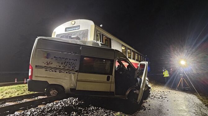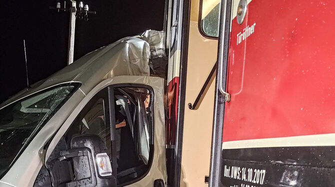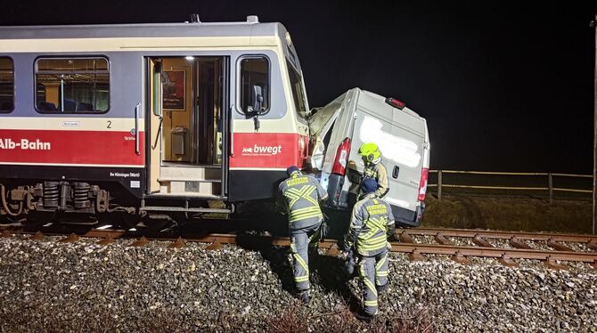 MÜNSINGEN. Die Fahrerin eines Lieferfahrzeugs hat am Donnerstagabend einen unbeschrankten Bahnübergang in Münsingen überquert, zur gleichen Zeit näherte sich ein Zug. Der Triebwagenführer leitete zwar eine Vollbremsung ein, kam aber nicht mehr rechtzeitig zum Stehen. Der Zug schleifte den Transporter noch etwa 50 Meter mit. Die Autofahrerin hatte Glück im Unglück, wie Jens Hojdar, Geschäftsführer der Schwäbischen Alb-Bahn (SAB) sagt. Hätte der Triebwagenführer ein Sekundenbruchteil später reagiert, hätte weit Schlimmeres passieren können. Die Frau konnte sich nach dem Unfall selbst aus dem Auto befreien und die Klinik, in die sie gebracht wurde, am Abend noch verlassen.