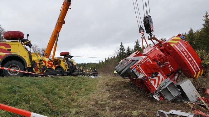 Die Bundesstraße zwischen Pfronstetten und Oberstetten blieb bis zum Donnerstagabend komplett gesperrt. Der verunglückte 48 Tonner wurde am Nachmittag von zwei 60-Tonnen-Kranwagen und zwei Lkw-Abschleppern mit Seilwinden aufgerichtet. Diese Aktion dauerte mit zahlreichen Vorbereitungen mehrere Stunden lang. Mit Einbruch der Dunkelheit wurde dann damit begonnen, den verunfallten Feuerwehrkran zuerst auf die Straße, dann auf den bereitstehenden Tieflader zu hieven. Der Verkehr wird nach wie vor über Steinhilben umgeleitet. Die Feuerwehr geht davon aus, dass die Bergungsarbeiten bis in die späten Abendstunden andauern. (GEA)