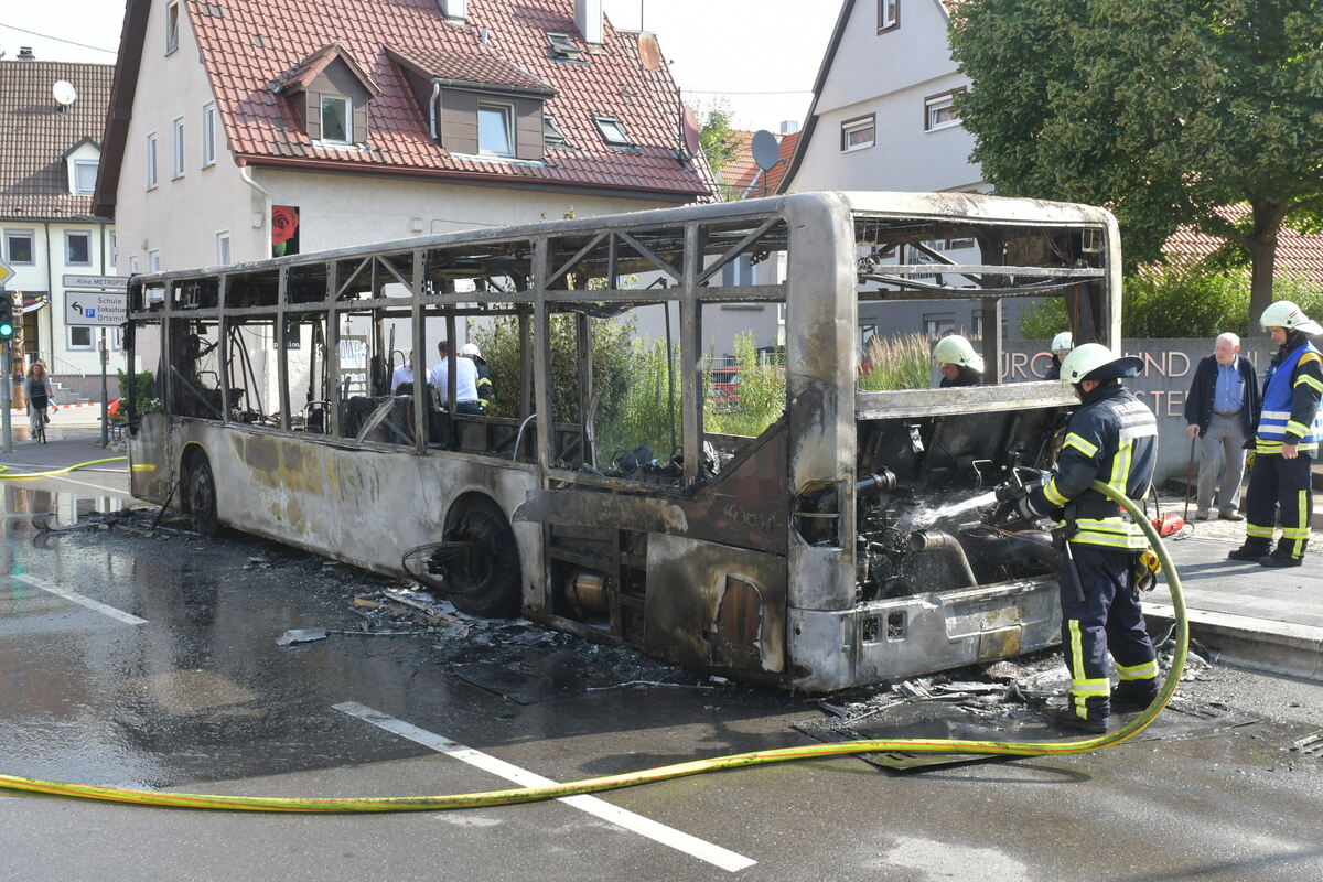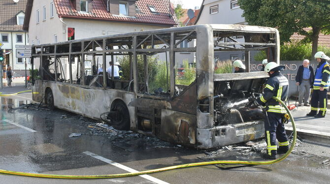 Gegen 7.50 Uhr hatte der Busfahrer während der Fahrt einen Rauchgeruch bemerkt, der 50-Jährige wählte daraufhin die Notrufnummer der Feuerwehr, die später mit vier Fahrzeugen und 20 Einsatzkräften eintraf. Sicherheitshalber hielt er vor dem Rathaus in Kusterdingen an und ließ die etwa 20 Mitfahrenden aussteigen. Kurz danach schlugen bereits die ersten Flammen aus dem Motorraum und fraßen sich durch den ganzen Bus. Der Busfahrer versuchte zunächst, den Brand mit eigenen Feuerlöschern zu bekämpfen. Vergeblich. »Der Bus ist bis zum Gerippe ausgebrannt«, bestätigte Pressesprecherin Andrea Kopp.