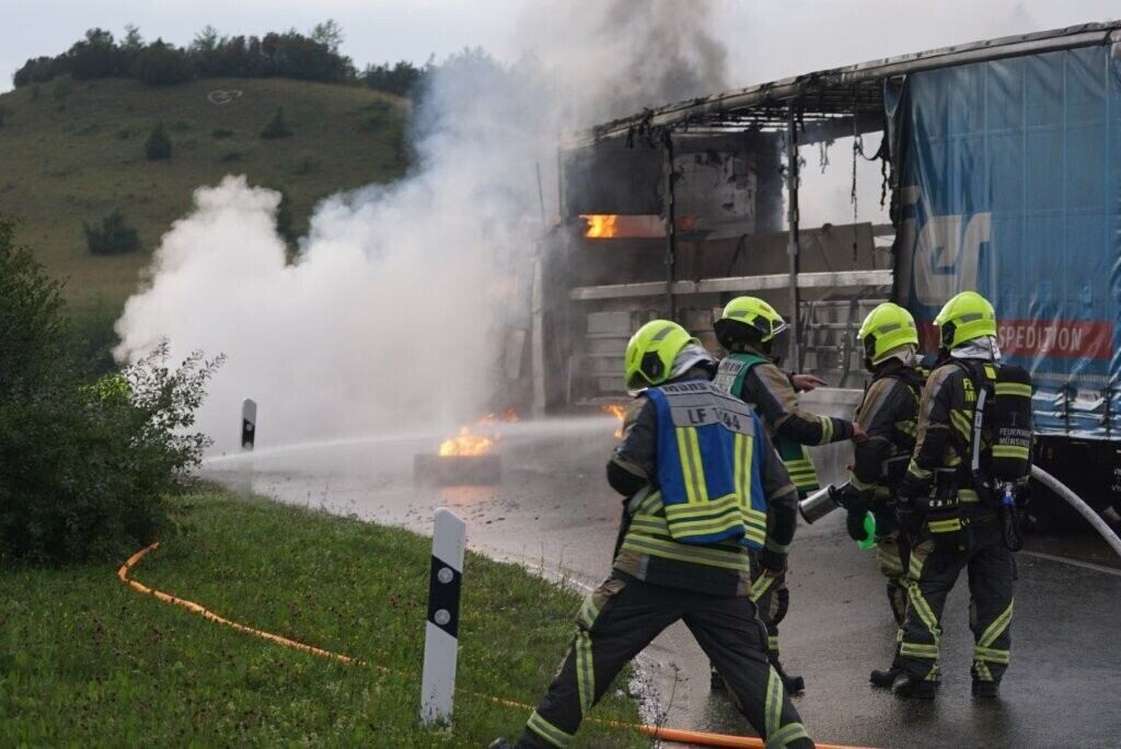 Löschversuche mittels Feuerlöscher und der schnelle Einsatz der Feuerwehr konnten nicht verhindern, dass das MAN Zugfahrzeug vollständig ausbrannte und auch der Auflieger schwer beschädigt wurde. Als Brandursache kommt ein technischer Defekt in Betracht. Verletzt wurde niemand. Der Fahrzeugschaden wird auf rund 30.000 Euro geschätzt. Die Unfallstelle war bis um 4.30 Uhr gesperrt.