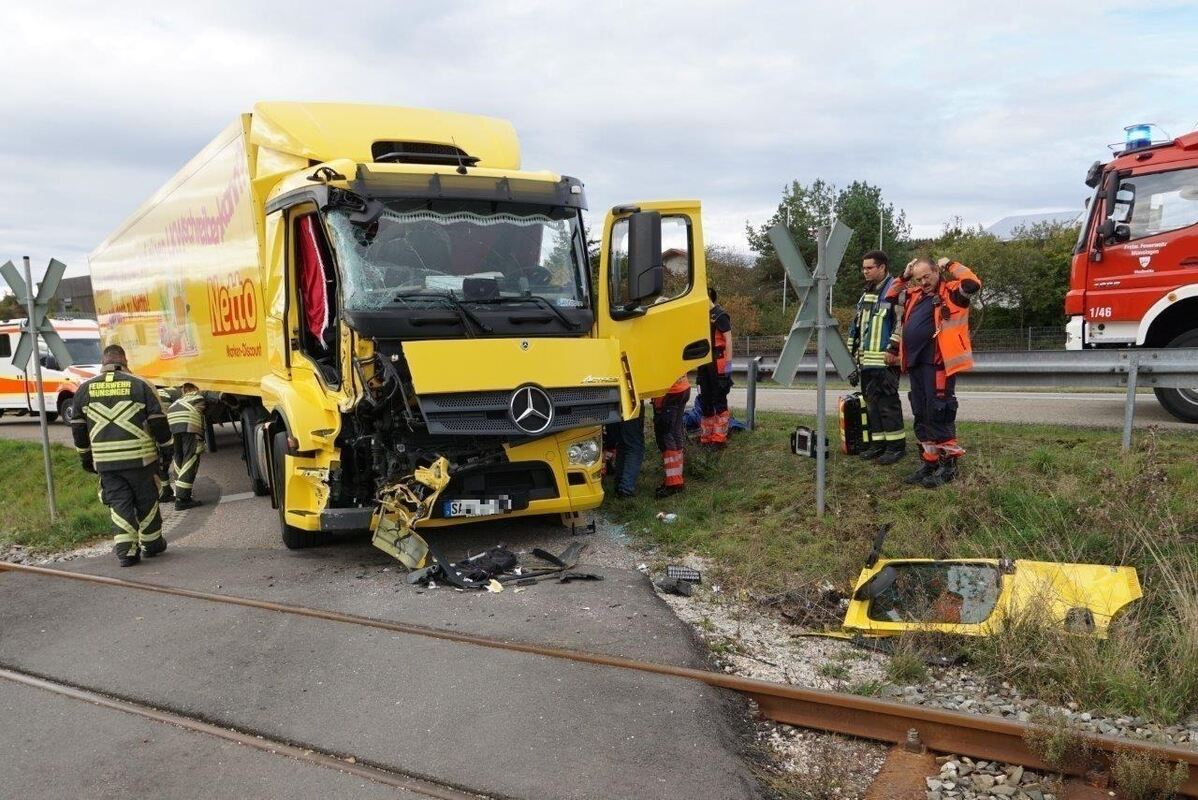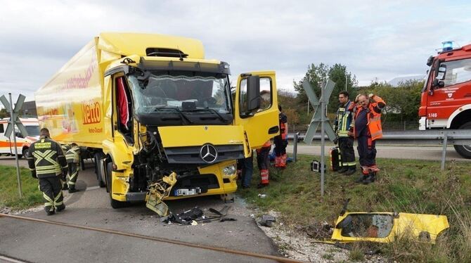 MÜNSINGEN. Ein 57-jähriger Lkw-Fahrer, der am Mittwochnachmittag gegen 16.20 Uhr mit seinem Fahrzeug an einem unbeschrankten Bahnübergang in Münsingen mit einem Triebwagen der Schwäbischen Alb Bahn (SAB) kollidiert war, wurde schwer verletzt. Der Lkw kam von der Verbindungsstraße der L230 her und war unterwegs in Richtung eines Pferdehofes. Er Lkw-Fahrer wollte einen unbeschrankten Bahnübergang queren. Dabei übersah er offenbar einen aus Richtung Marbach heranfahrenden Zug. Beim Zusammenstoß wurde die Beifahrertüre des Lkw abgerissen. Der 32-jährige Lokführer leitete noch eine Bremsung ein, konnte einen Zusammenstoß aber nicht mehr verhindern. Das Zugpersonal und die Fahrgäste blieben unverletzt, teilte die Polizei auf Anfrage mit. Sie schätzt den Schaden am Triebwagen auf rund 50.000 Euro, am Lastkraftwagen auf etwa 20.000 Euro. Bis zum Abschluss der Bergungsmaßnahmen war die Zugstrecke bis etwa 18.45 Uhr gesperrt.