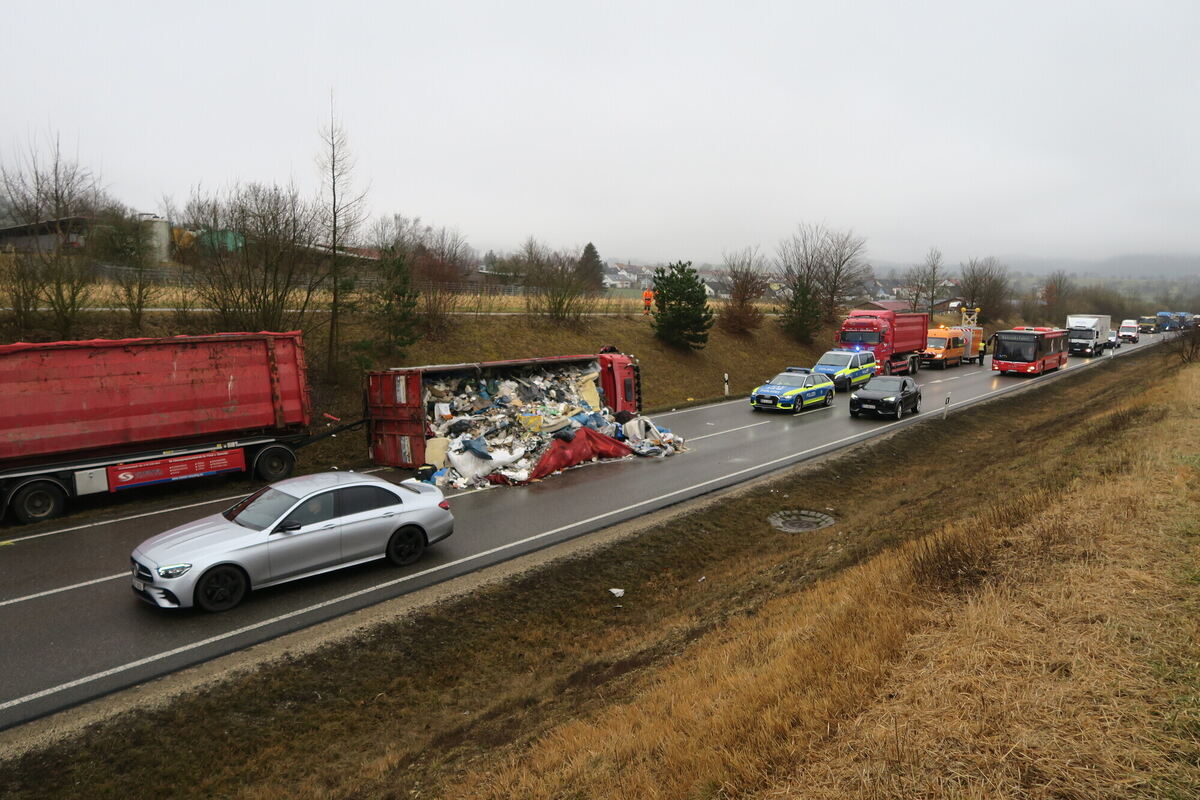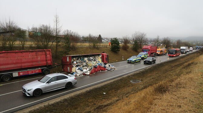 Die Bergungsarbeiten waren aufwendig. Zwischenzeitlich waren auch beide Spuren durch den Müll blockiert. Dann räumte ein Radlader diesen weg und lud ihn auf einen anderen Lastwagen. Außerdem zog der Radlader den Anhänger aus dem Grünstreifen. Mit einem Kran sollte der Lastwagen aufgerichtet werden. Nach der dreistündigen halbseitigen Sperrung musste dafür die B 28 einige Zeit voll gesperrt werden. (GEA)