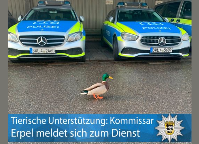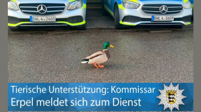 TÜBINGEN. Dass die Polizei in Tübingen doch nicht alles so tierisch ernst nimmt, hat sie heute bewiesen. Just zum Dienstbeginn am Morgen hatte sich ein vermeintlicher neuer Mitarbeiter auf dem Parkplatz der Dienstfahrzeuge eingefunden und ein Kollege hatte den Zweibeiner fotografiert. Offenbar hatte er ihn gleich als neuen Mitarbeiter ins Herz geschlossen. Das konnte nur Kommissar Erpel sein. Mit einem nicht ganz so tierisch ernst gemeinten Text verbreiteten die Beamten den Schnappschuss in den sozialen Medien und fügten hinzu: »Kommissar Erpel pflichtbewusst in Tübingen zum Dienst gemeldet.« Bedauert wurde, dass der »Neue« nicht länger am Arbeitsplatz blieb. Die Erklärung war aber schnell gefunden: »Vermutlich, weil er seine Uniform zuhause vergessen hatte.« Eins ist diese Meldung jedenfalls nicht: eine Ente. (GEA)
