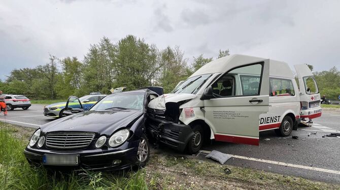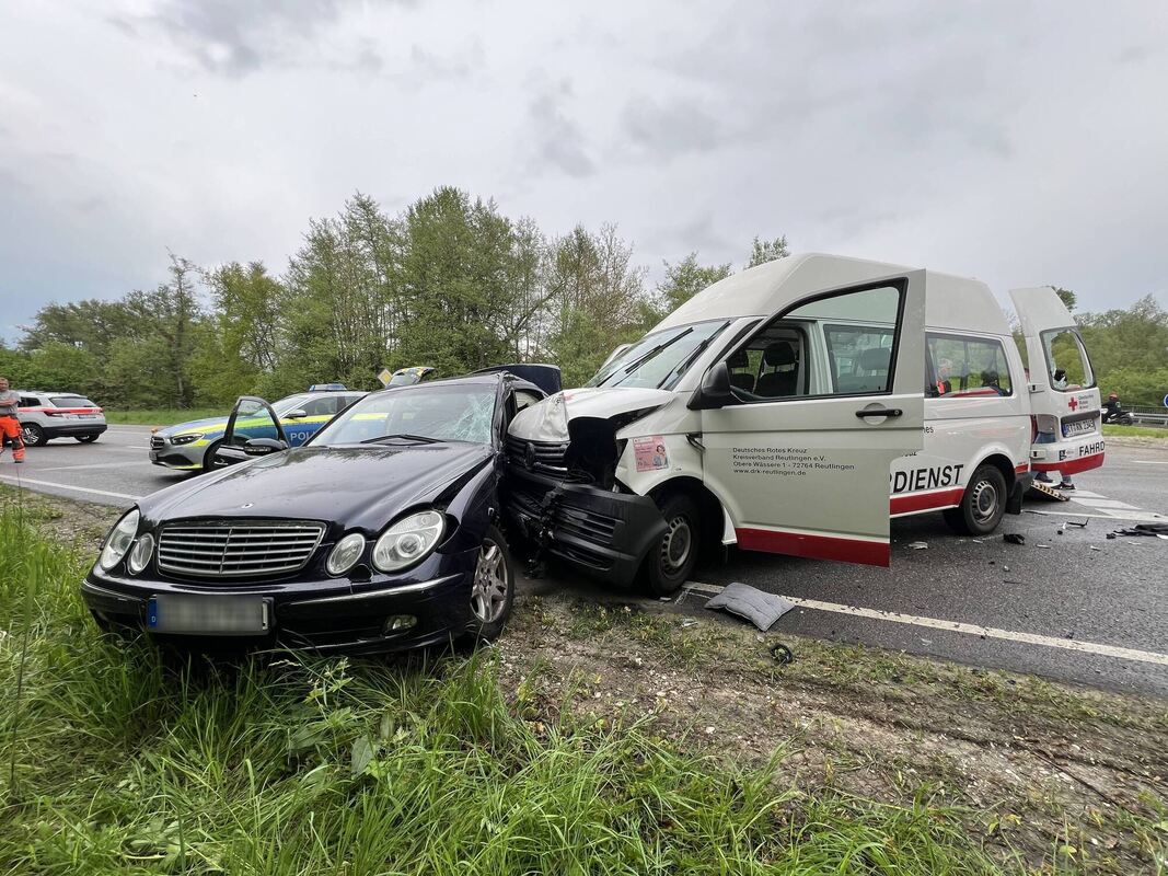 Beim Einfahren auf die Bundesstraße missachtete sie die Vorfahrt eines 52 Jahre alten Mannes, der mit einem Krankentransportwagen von Reutlingen herkommend unterwegs war. Der Wagen des Mannes kollidierte frontal mit der Fahrerseite des Mercedes, der durch den Aufprall nach links auf die Gegenfahrbahn geschoben wurde. Die Unfallverursacherin und ihr 17 Jahre alter Beifahrer wurden in der E-Klasse eingeklemmt und mussten von der Feuerwehr befreit werden. In dem Krankentransportwagen wurde eine 74-jährige Patientin befördert.