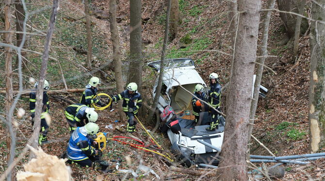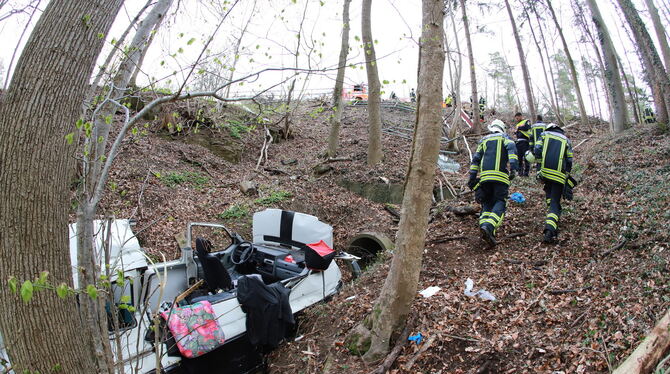GÖNNINGEN. Am Samstagnachmittag ist es auf der L 383 zu einem spektakulären Verkehrsunfall gekommen. Gegen 13.30 Uhr befuhr ein 61-jähriger Mann in seinem VW Bus die Landstraße in Richtung Gönningen. Mit im Fahrzeug befanden sich seine 59-jährige Ehefrau und ein Hund. Im Bereich einer Linkskurve kam der VW in den Grünstreifen. Beim Gegenlenken durchbrach das Fahrzeug ein Schutzgeländer und rutschte einen bewaldeten Abhang hinunter, sagt die Polizei. Der VW prallte mit der Beifahrerseite gegen einen Baum und kam in einem Bachbett zum Liegen. Der Fahrer konnte sich selbst aus dem Fahrzeug befreien, seine Beifahrerin musste durch die Feuerwehr gerettet werden. Der Hund konnte unverletzt aus dem Autowrack befreit werden.