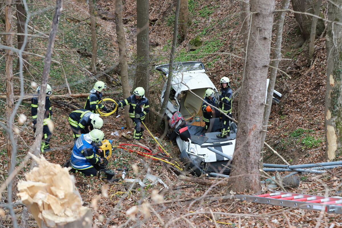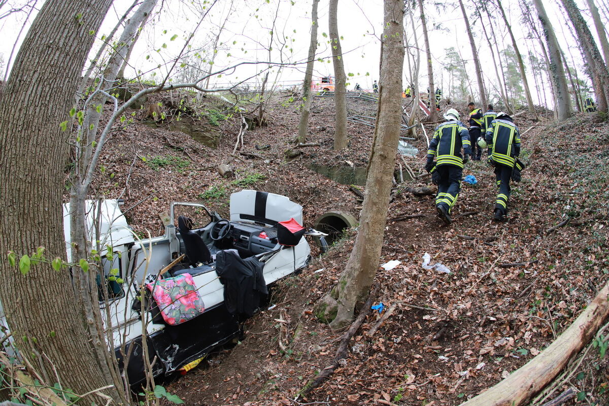 Beide Insassen wurden vor Ort durch den Rettungsdienst behandelt und anschließend in ein Krankenhaus gebracht. Die Frau erlitt durch den Unfall schwere und der Mann leichte Verletzungen. Die Bergungs- und Rettungsmaßnahmen durch Feuerwehr und Abschleppdienst gestalteten sich aufgrund der komplizierten Unfallendlage des VW schwierig. Das Fahrzeug lag ca. 20 Meter im Wald und ca. 10 Meter tiefer als die Fahrbahn. Zur Bergung wurde vor Ort ein großer Kran eingesetzt. Die Straßenmeisterei war zur Sicherung der beschädigten Verkehrseinrichtungen ebenfalls vor Ort.