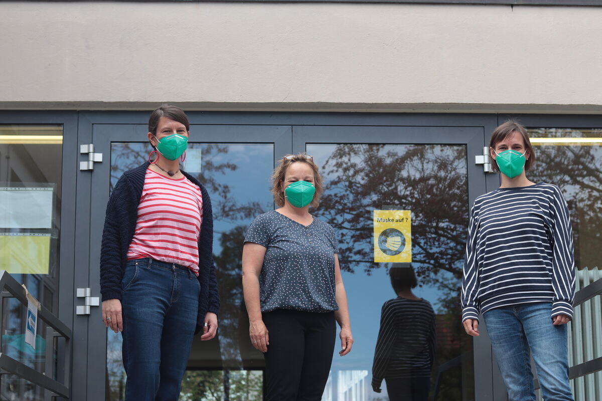 Maske ist für alle in der Gomaringer Schloss-Schule Pflicht: die Schulsozialarbeiterinnen Silke Hildenbrand, Susanne Schetter und Mandy Siemß vom Förderverein.