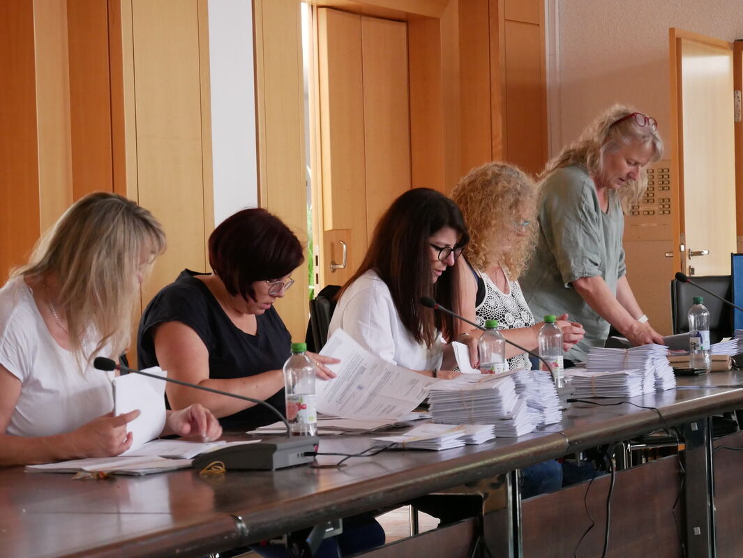 Wahlhelferinnen zählen im Metzinger Rathaus Stimmen der Europa-, Kreis- und Kommunalwahl aus.