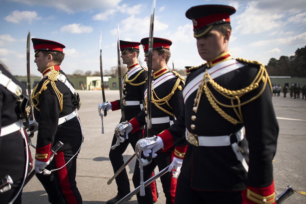 Soldaten der britischen Garde-Kavallerie zugehörigen Blues and Royals (Die Blauen und die Königlichen), proben für die Beerdigung von Prinz Philip. FOTO: JONES/DPA