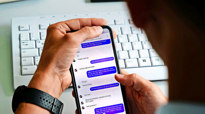Der Experte der Polizei prüft den Chatverlauf zu den angeblichen Finaltickets. FOTO: BRAND