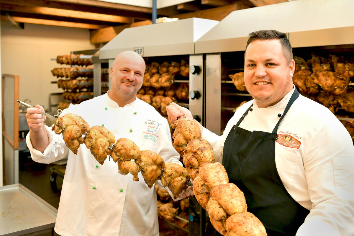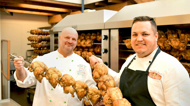 Küchenchef Alexander Hilt (rechts) und Csaba Farkas bereiten die Göckele im Dinkelacker-Festzelt zu. FOTO: LICHTGUT/KOVALENKO