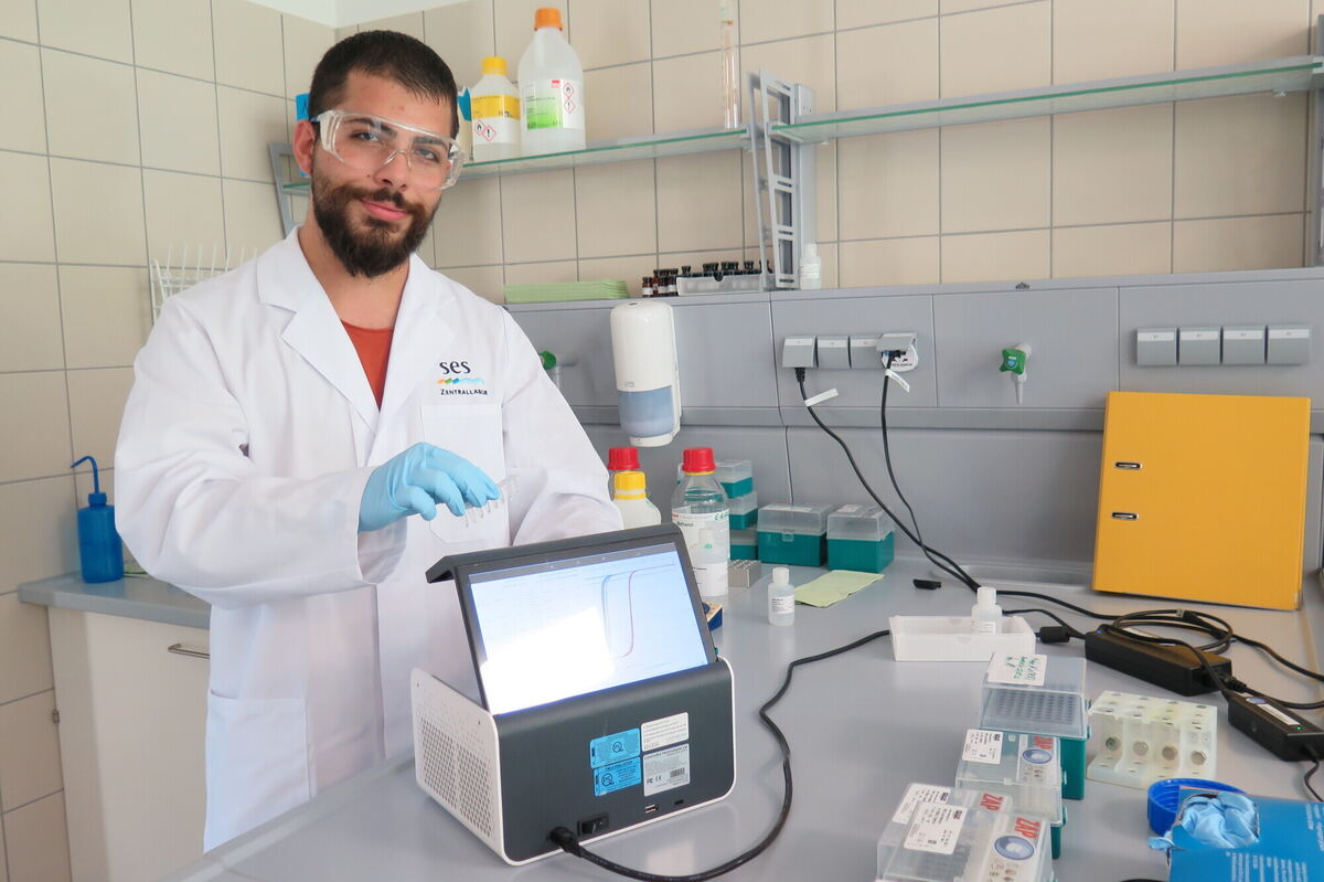 An der Messstation: Chemielaborant Alessandro Pucciarelli ermittelt mit dem PCR-Testgerät die Viruslast im Abwasser. FOTOS: STEINRÜCKEN