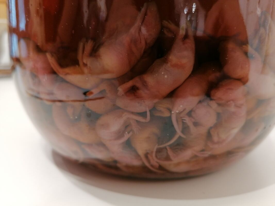 Mäusebabys werden ertränkt und in Reiswein gebraut. Die Mäuse dürfen erst ein paar Tage alt sein, da sie blind und haarlos sein müssen. Das Gebräu wird bis zu einem Jahr gelagert, bevor es verzehrt wird. Mäusewein wird nicht als Aperitif sonder als Gesundheitstonikum bei Asthma und Lebererkrankungen getrunken. Mäusewein schmeckt wie Benzin mit einem Nachgeschmack nach verrottenden Tieren.