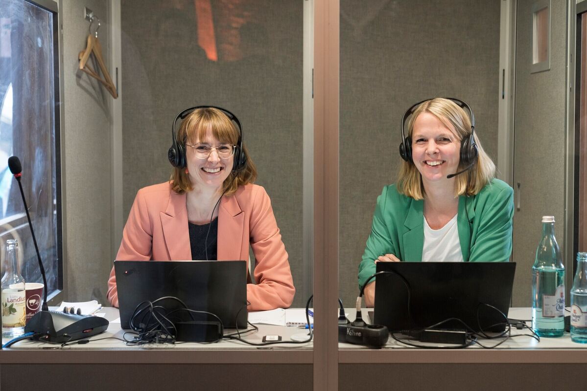 Typische Arbeitssituation: Monika Ott beim simultanen Dolmetschen in einer Kabine. Beruflich benutzt sie Englisch, Schwedisch und natürlich Deutsch. Wer Dolmetscher werden will, muss das sprachliche Talent dazu schon mitbringen. Sie spricht darüber hinaus noch einige weitere Sprachen. FOTO: PRIVAT