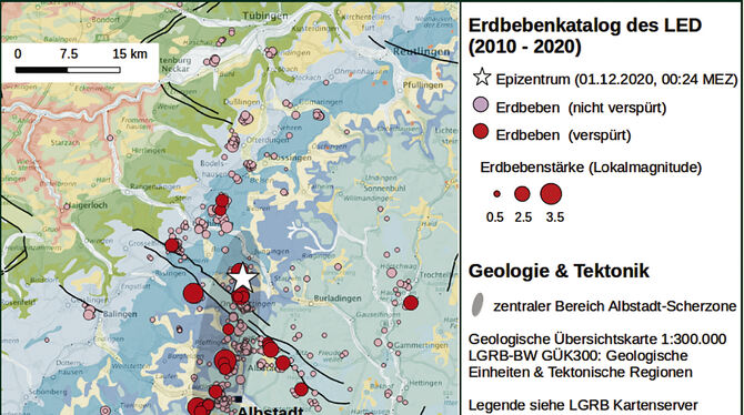 Erdbeben mittlerer Stärke sind nichts Sonderliches auf der Schwäbischen Alb. »Momentan häufen sich die Erdbeben im Zollernalbkreis«, erklärt Dr. Stefan Stange vom Landeserdbebendienst Baden-Württemberg: »Es gibt immer Phasen, da sind es mal mehr und mal weniger.« Denn Baden-Württemberg ist das seismisch aktivste Bundesland. Die tektonischen Regionen des Bundeslandes, in denen es öfter bebt, sind eingeteilt in den Odenwald, das nördliche und südliche Schichtstufenland, den Oberrheingraben, den Südschwarzwald und das oberschwäbischen Molassebecken. Am stärksten betroffenen sind die Gebiete auf der Schwäbischen Alb und in der Gegend von Lörrach.