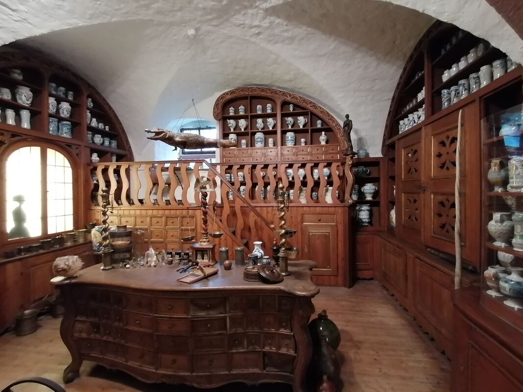 Die Bamberger Hofapotheke von 1730: Ein Krokodil hängt über dem Tisch, links auf den Tisch steht ein Kugelfisch und rechts an der Wand hängt ein Einhorn. Verkauft wurde durch das Fenster ganz links. FOTO: ZIMMERMANN