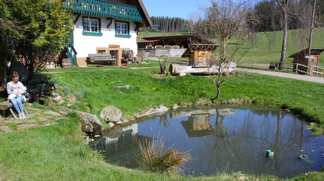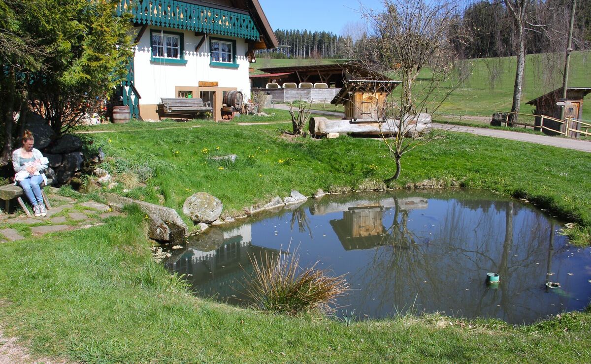 Die Brigach entspringt im Keller des Hirzbauernhofs. Im Weiher vor dem Hof tritt sie erstmals an die Öffentlichkeit.