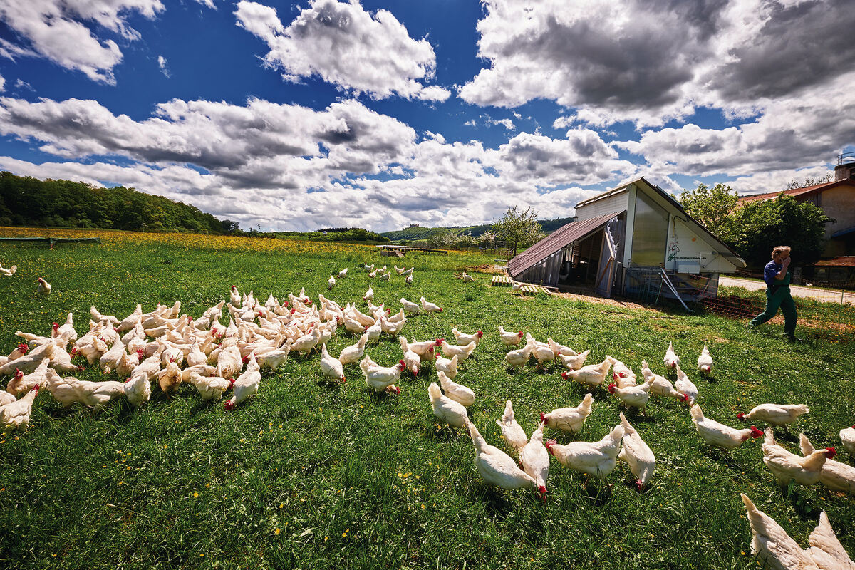 Auf dem Jagsthof in Westhausen werden Hühner zu Wandervögeln: Ein Teil der Legehennen lebt in einem Wanderstall. Und wer selbst etwas für die Tier- und Pflanzenwelt tun will, erfährt, wie eine artenreiche Blumenwiese angelegt wird.