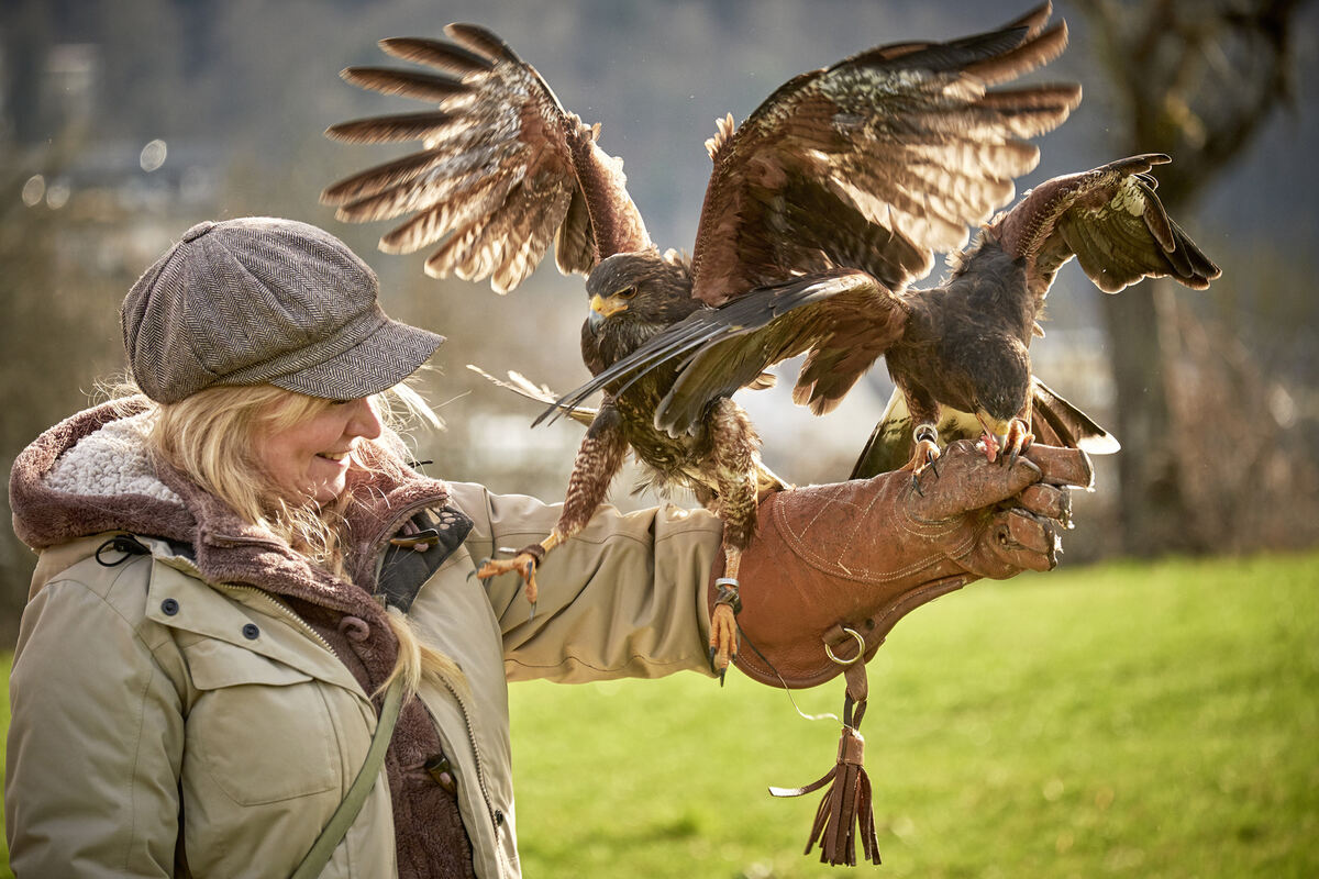Landen will gelernt sein: Wenn zwei Harris Hawks sich streiten, wird es eng auf dem Falknerhandschuh. FOTO: HEINZ HEISS