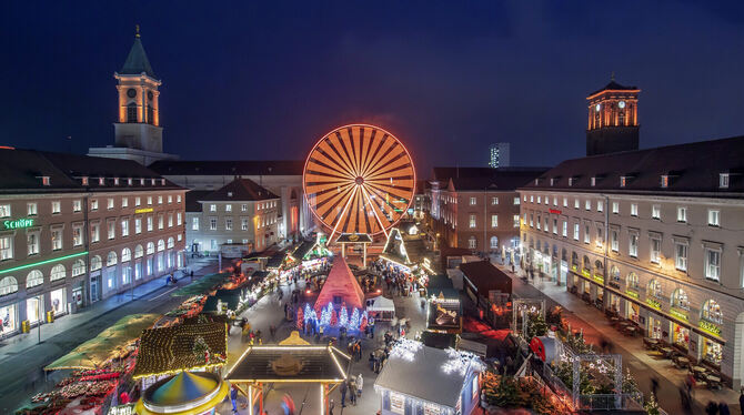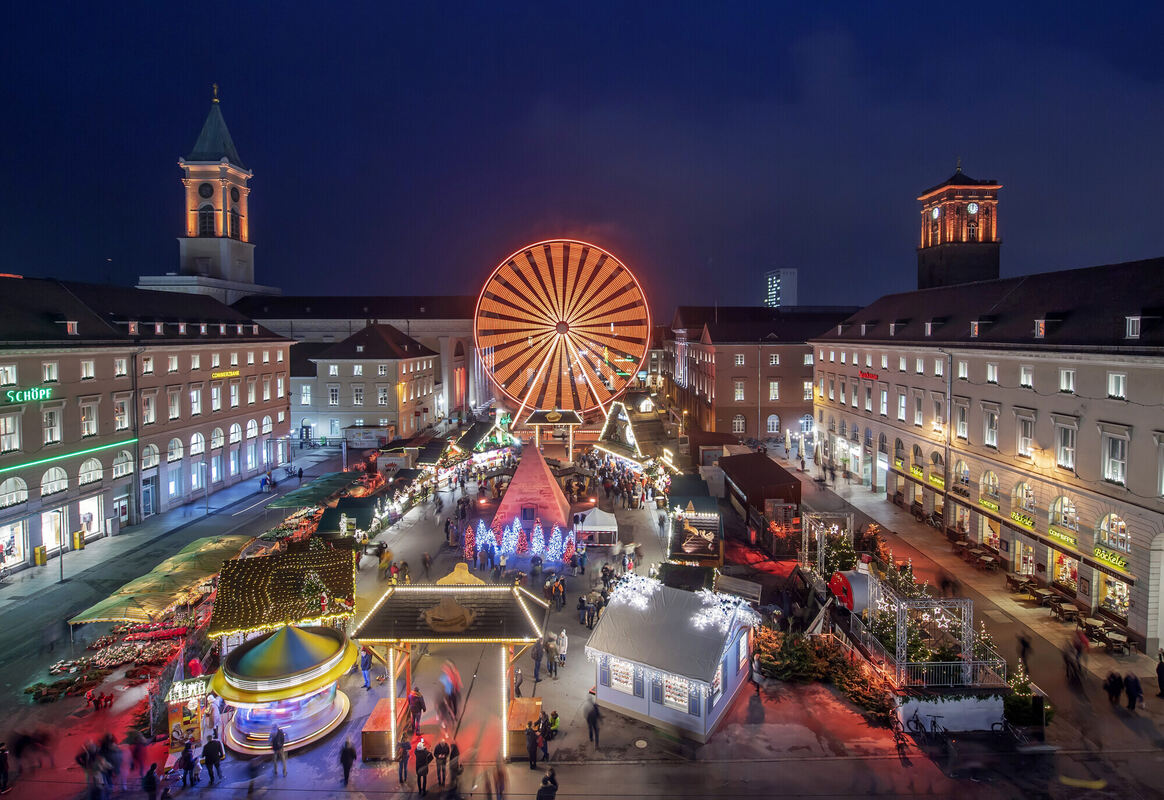 In Karlsruhe kann der Christkindlesmarkt auf dem Markt- und Friedrichsplatz auch aus der Luft bestaunt werden: Ein Riesenrad mit geschlossenen Gondeln ist hier eine der Besonderheiten. Für Begeisterung dürfte auch der fliegende Weihnachtsmann mit seinem 500 Kilogramm schweren Schlitten und den Rentieren sorgen, der zweimal täglich über den Köpfen der Besucher hinwegschwebt – immer um 17 und 19.30 Uhr. »Hinter der bärtigen Maske verbirgt sich einer der weltweit besten Hochseilartisten – Falko Traber.« Der Weihnachtsmarkt in der Fächerstadt läuft vom 24. November bis zum 23. Dezember. Öffnungszeiten: Sonntag bis Donnerstag von 11 bis 21 Uhr, Freitag und Samstag von 11 bis 22 Uhr.
