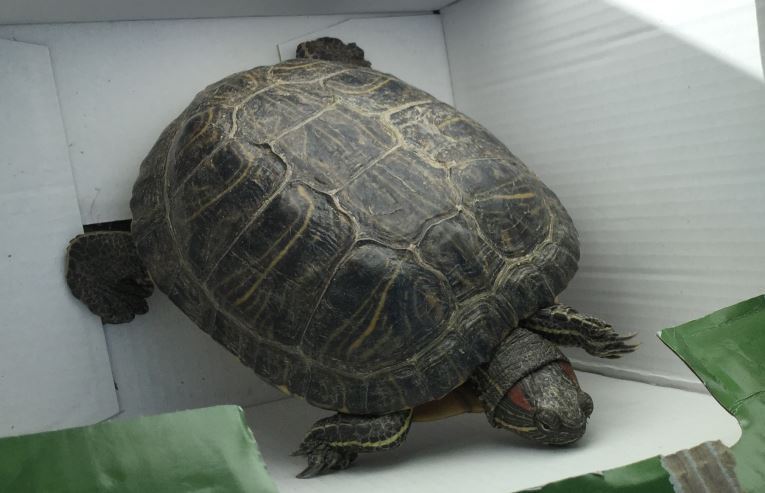 Aber alles Zappeln half nichts. Die Schildkröte wurde in einen Karton gelegt und in ein Tierheim verbracht. Ersten Ermittlungen nach dürfte es eine Wasserschildkröte aus einem Außengehege sein, die sich für die Jahreszeit üblich, auf die Suche nach einem geeigneten Platz zur Eiablage machte.