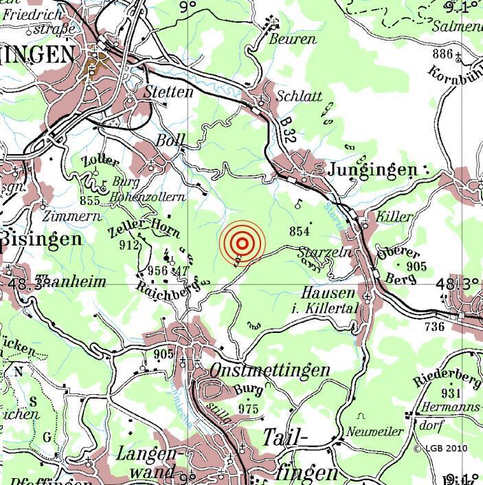 Nach übereinstimmenden Messungen lag der Herd unterhalb des nördlichen Albtraufs, an der Markungsgrenze von Hechingen-Boll nach Jungingen und Burladingen-Hausen. Allerdings recht tief, rund 16,4 Kilometer unter der Erdoberfläche.