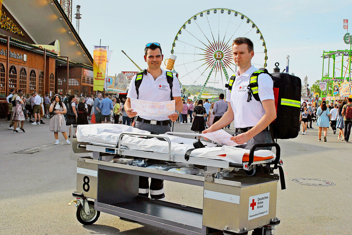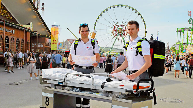 Mit der Rolltrage auf dem Cannstatter Wasen: Alexander Jahn und Maximilian Niemann (rechts) sind ehrenamtlich beim Stuttgarter Frühlingsfest im Einsatz. FOTO: STEEGMÜLLER
