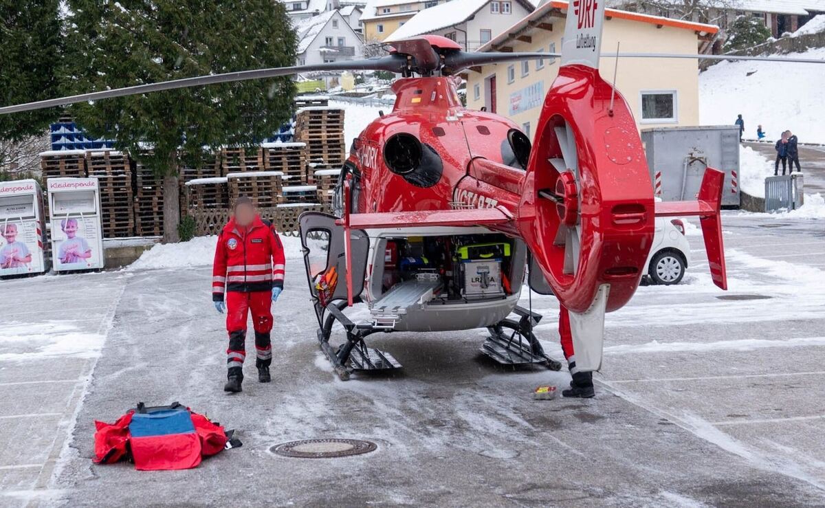 Helfer stehen an einem Rettungshubschrauber. Foto: Einsatz-Report24